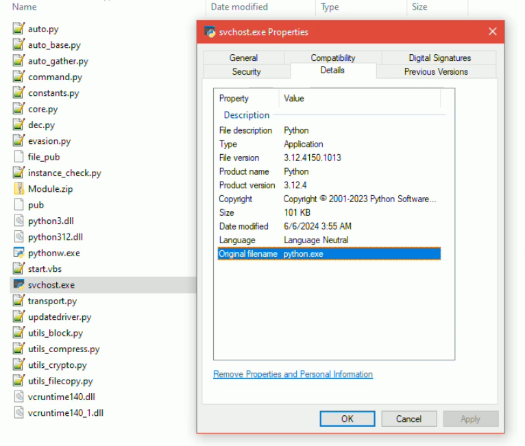 Note that the svchost.exe binary here is actually a Python interpreter, which can be a dead giveaway for detection based on the file's location outside of system files and Original filename of "python.exe".