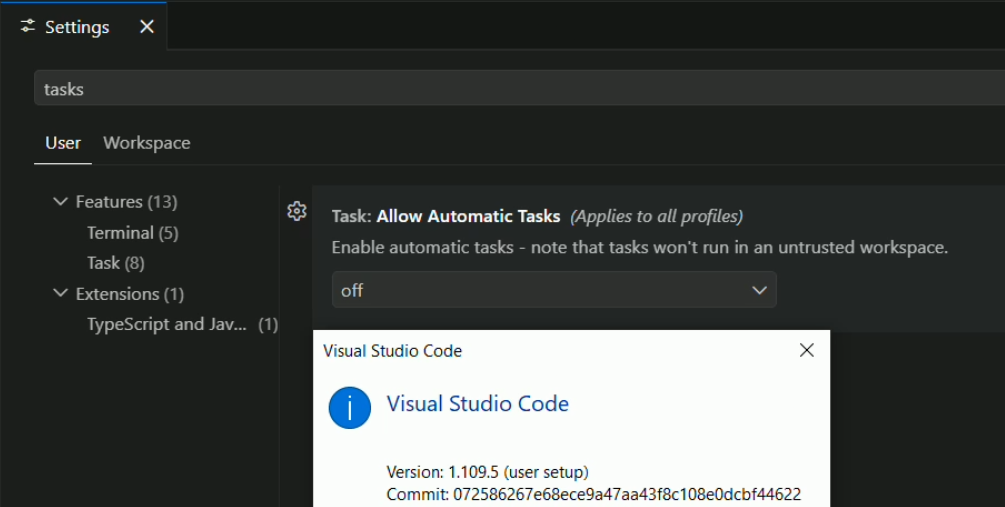 However, note that selecting to allow automatic tasks is not scoped to just that workspace, but rather sets the global task.allowAutomaticTasks user setting back to "on", which affects all workspaces. This means that, while the additional prompt is an improvement for mitigation, it isn't a fail-safe. Along with Workspace Trust and Extension Update settings, the Automatic Tasks setting should also be regularly audited as part of application policies.