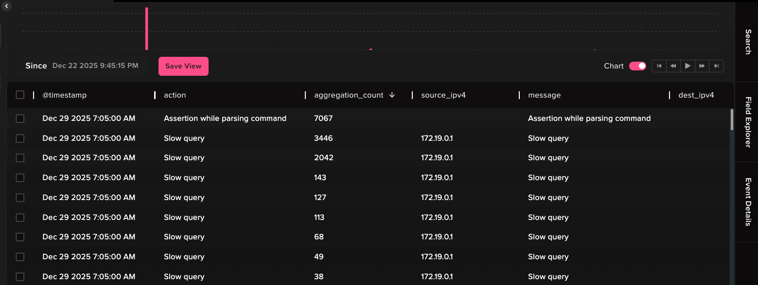 Aggregating these “Slow query” events, while keeping useful information such as the source IP address, message and error message, provides tremendous signaling value without having to waste resources on processing low value log data.